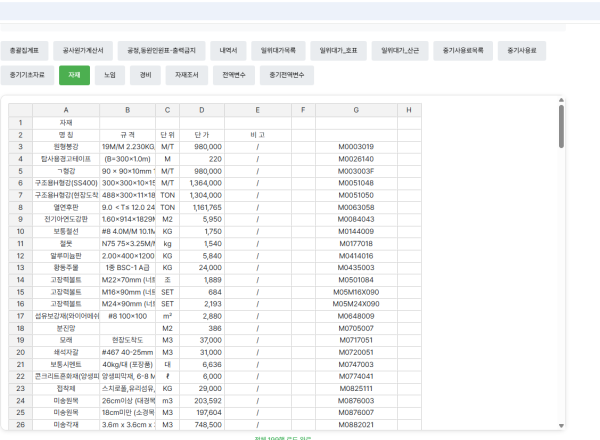 각개별 적용코드는 첨부화일처럼 구분되어진다. 여기서 자재 코드는 넛트라고 하자 그 너트에는 여러가지 공산품적인 분류가 들어 있게되는데 그 분류코드에 따라 천차만별의 품종과 가격대가 형성되어진다 그에따른 코드체계를 분류해 놓은것이다